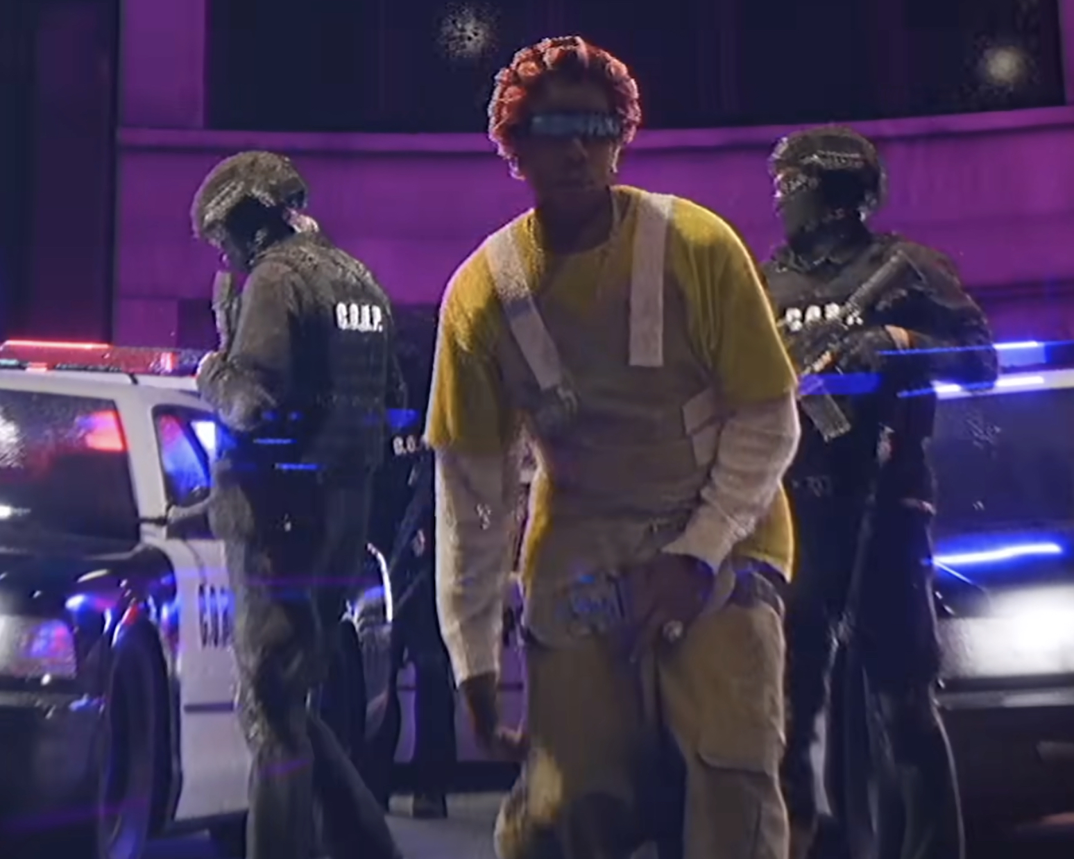Just outside of the “headquarters,” it gets even more chaotic as an actual drone (as opposed to a helicopter that doubles as a drone), red laser and all, whooshes through the scene like the most hostile insect ever, only for Rocky to “swat” it away with his baseball bat before the next abrupt cut. To be sure, the jarring cuts and camera movements are paramount to maintaining an anxiety-inducing level of chaoticness throughout the video, complete with A$AP riding by in a mini pink car (serving a Barbie Corvette, Power Wheels edition vibe) as he raps, “I ride around in the all-pink Mercedes, the pussy whip” (not to be confused with a Pussy Wagon). Rocky then slips by a number of dressed-in-all-black federal agent types (clearly meant to look like S.W.A.T. and ICE) with a uniform logo that reads “C.O.R.P.” on the back. As he weaves through the streets in his “pussy whip,” these agents are also shown dragging people out onto the sidewalk, pissing on a lamppost and generally oppressing.