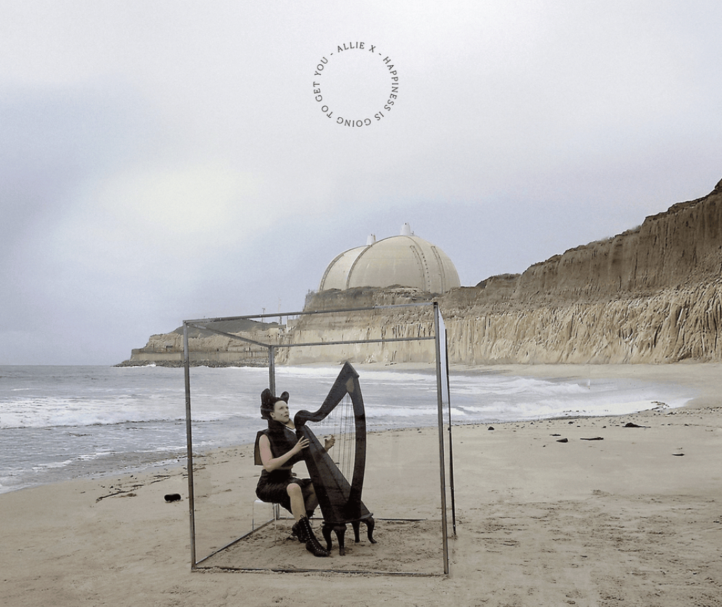 Perhaps, as if to highlight that point, Allie X’s album cover for HIGGY features her dressed in full “Infant Marie” attire as she sits inside her “usual” glass box with a harp in front of her. And while the glass box is theoretically positioned on a “picturesque” beach, the nuclear power plant (specifically, the San Onofre Nuclear Generating Station, which spells out the “convenient”—even if misleading—acronym, SONGS) that looms above her is part of Allie’s tongue-in-cheek way of accenting what she said about how this record captures the feeling of being “caught between nostalgia, hope and dread.” It is the latter sensation one feels when realizing that the title of the next track, “I Hope You Hear This Song” isn’t exactly coming from a place of “wishing someone well” either (much the same that “Happiness Is Gonna Get You” isn’t). That much is immediately clear about twenty-four seconds into the song, when X drones, “I hope this melody starts to haunt you endlessly.” And so, here again, she proves herself to be quite the Poe referencer, with such a “hope” echoing the kind of haunting that occurs in “The Tell-Tale Heart.”