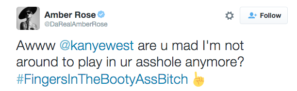 Amber Rose’s eventually cut and dried commentary?: “Awww @kanyewest are u mad I’m not around to play in ur asshole anymore? #FingersInTheBootyAssBitch”. Game over, she shut it down. For a man as prideful and self-deluded as Kanye, there is no greater insult than having his enjoyment of ass play put on blast. Now, the more he tries to deny it with statements like, “Exes can be mad but just know I never let them play with my ass… I don’t do that… I stay away from that area all together,” the more ridiculous and homophobic he seems. Because denial is always convincing, isn’t it? In any case, Rose shows exes everywhere that information is always powerful, no matter how long ago the relationship died.