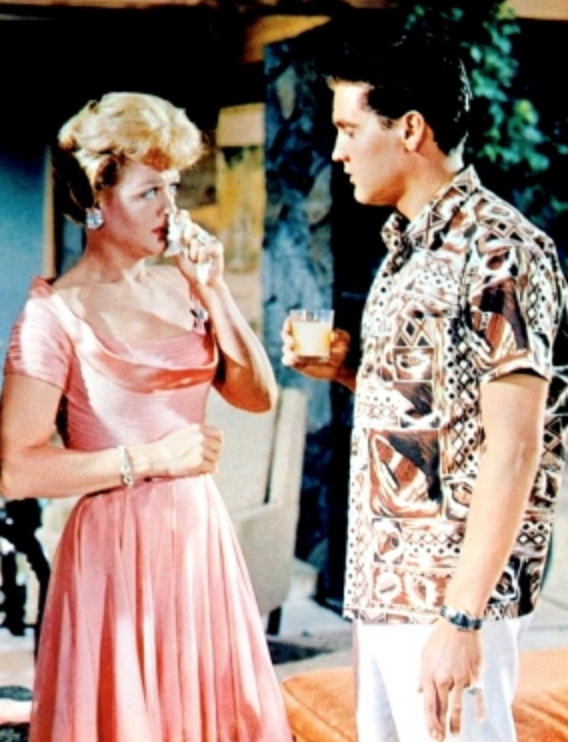 This notion of the female as the ensnarer to be avoided for as long as humanly possible until enough oats have been sewn is a consistent theme throughout Blue Hawaii. Sarah Lee, with her whimpering, sniveling and inexplicable sense of anxiety is the pinnacle of false perception when it comes to women. Tragically, just because it’s no longer “acceptable” to portray the female gender in this manner in cinema does not mean that many a man doesn’t still regard the archetype of “her” as such. And since it would be too grotesque to lay all the stereotypes of the feminine lack of mystique on Sarah Lee, we have Ellie to play the sordid underage minx who says things like, “Ever seen anything like this in a cradle?” after sticking her tits out when Chad calls her a baby. The uncomfortable gender dynamic doesn’t stop there though. Like Ricky Ricardo before him, Chad sees fit to eventually take Ellie over his knee and give her the “spanking she’s been needing.”
