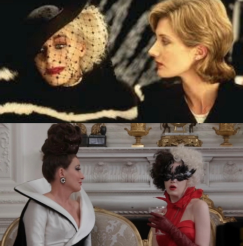 One parallel missing between Cruella and 1996’s 101 Dalmatians is the persona embodied by Anita. In 101 Dalmatians, Anita (Joely Richardson, looking a lot like Natasha) is no longer just a bookish woman reading in a park, but a bookish woman who also creates innovative fashion designs and illustrations. So innovative, in fact, that Cruella can hardly ever wait to snap them right up from her. Kind of the way Baroness does when she catches Estella sketching on her lunch break and has her guards escort her back in so she can steal the drawings and claim them as part of her own Baroness oeuvre. In contrast to Estella, Anita is slightly more willing to be ripped off, mainly because she doesn’t seem to have as much ambition as Estella in terms of carving out her own name in the fashion realm. And when Cruella warns that, any day now, one of her competitors is going to find out who her best designer is and steal her away, Anita merely shrugs that the only thing that might lead her to leave would be, perhaps, romance. Cruella balks, “More good women have been lost to marriage than to war, famine, disease and disaster. You have talent, darling, don’t squander it.” Anita, alas, simply isn’t that forward-thinking. Even if this script is supposed to reflect being in the “modern” 90s. It’s still a Disney movie, after all: misogynistic and heteronormative rhetoric is required.