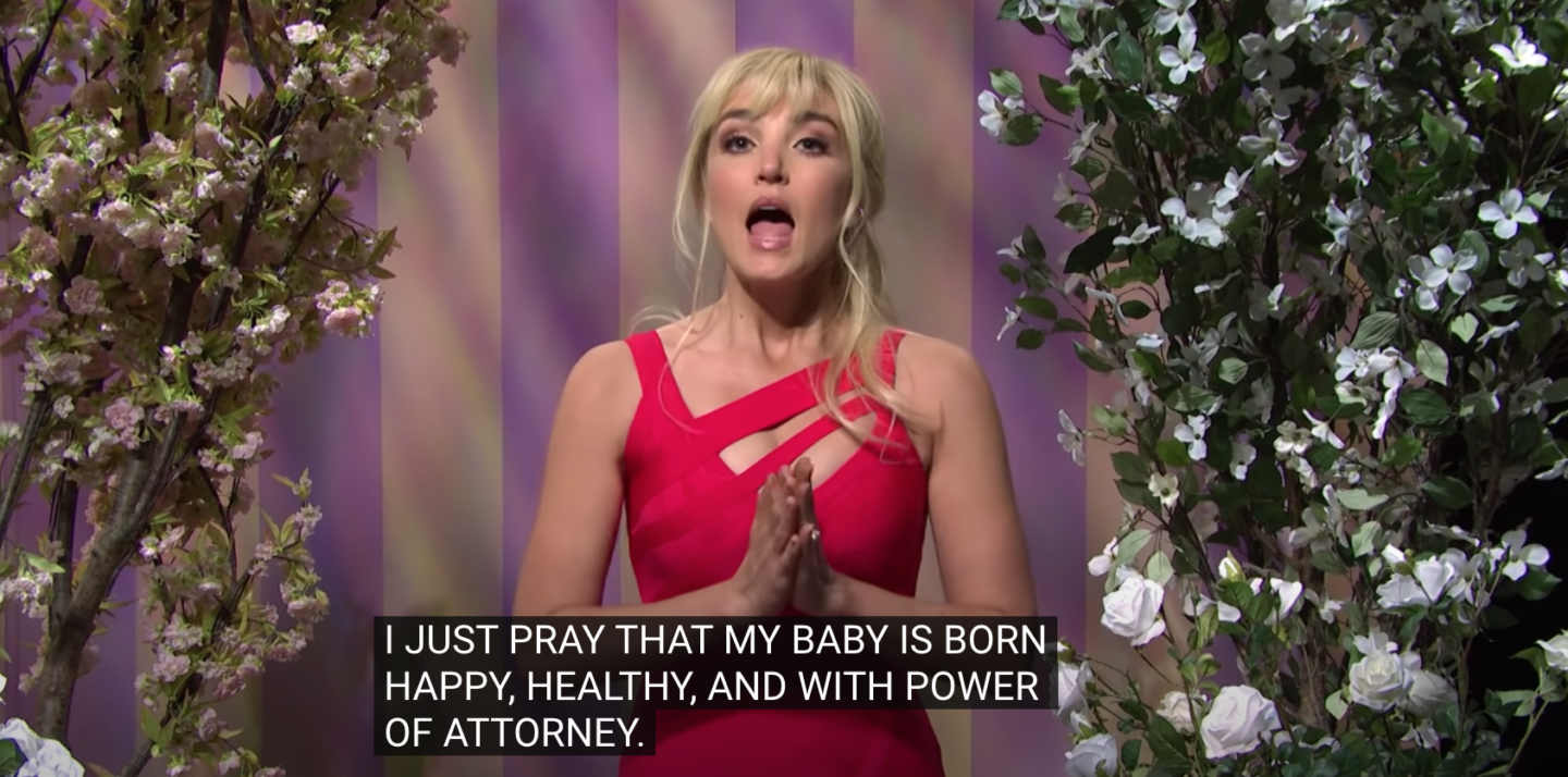 And yet, no one on the SNL writing team was looking at Brit with new eyes on that Lizzo episode. Opting to already bring Britney’s baby news into the public commentary forum with an “Easter Wishes” introduction from a smattering of celebrities ranging from “Jared Leto” to “Elon Musk.” Whose portrayal by Mikey Day was followed by Chloe Fineman as (once again) “Britney” saying, “Hey y’all” (making her sound more like Miley Cyrus). “It’s me, Britney—and I bet you didn’t think I could do this.” She then proceeds to mock Britney’s usual brand of dancing as seen on her many Instagram videos. In a form-fitting red bodycon dress also meant to play up Spears’ persona as some kind of image-obsessed tart, she continues, “Now, remember six months ago, when everyone was like, ‘We need to get her out of this conservatorship’? And now you’re like, ‘Someone’s still gonna check on her, right?’” The audience laughter then pours in, adding to the cringe of it all. “Well, don’t worry. I’m finally free. And I’m having a baby! I just pray that my baby is born, happy, healthy and with the power of attorney.” The laughter at this is slightly less pronounced, but comes—in a forced manner—regardless. She then does her imitation-Britney twirl again as the crowd cheers her saying, “Happy Easter everyone!”