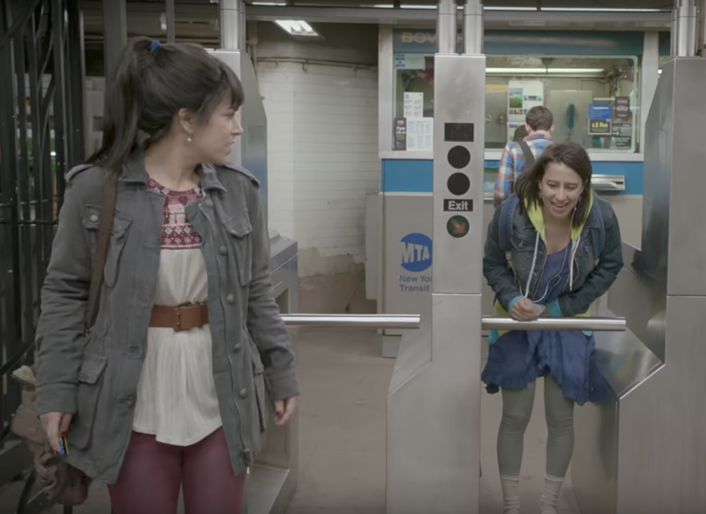 Thus, with the ominous ponytail cutter at large as Abbi (Abbi Jacobson)–voluminous ponytail sported in that Andrew McCarthy in Pretty in Pink sort of blatant wig–enters the subway, we find she’s short the required fare, a mere $2.25 in 2011. Fellow incoming subway passenger Ilana (Ilana Glazer) is generous enough to give her a swipe, only to herself be left without enough money to enter. This delay, paired with the direction of a businessman’s projectile vomit in reference to how it affects Abbi and Ilana’s pathway to the train, ultimately leads the new acquaintances on two different potential outcomes of the day.