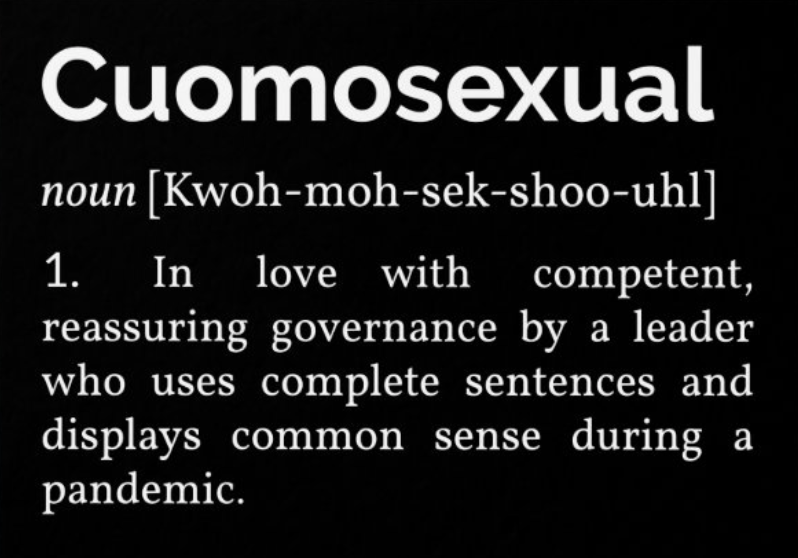 Gone are the days of the “t-shirt ready” saying, “I’m A Cuomosexual” or, plainly, “Cuomosexual.” One component of merchandise in the form of a greeting card even went so far as to accompany the term with an “official” definition: “In love with competent, reassuring governance by a leader who uses complete sentences and displays common sense during a pandemic.” Damn, have we sunk so low as a nation that we revere people who display the slightest level of appearing to know what they’re doing?