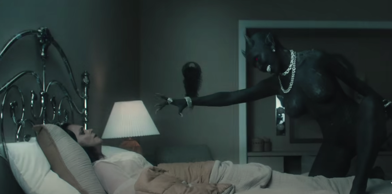With a backing beat that has echoes of Busta Rhymes’ 1998 track, “Gimme Some More” (which itself samples from the Psycho theme), Doja’s aggressive tone punctuates the sinister sonic landscape produced by D.A. Got That Dope (which doesn’t have quite the same ring as Mike WiLL Made-It). And as Ricci lies in bed seemingly paralyzed by a combination of shock and fear (so often one and the same), Demon Doja inches closer to Ricci while still on the ceiling. She then taunts her with such “flexes” as, “You look like me…in your dreams”—while said in the guise of a horrifying hellhound (this somewhat harkening back to the absurdity of Doja posting an unflattering photo of her face and labeling it a “thirst trap”). From the ceiling, she then ends up back at the edge of the bed, her claw-like hand slithering up the side of the frame in what itself feels like a nod to Freddy Krueger in Nightmare on Elm Street.