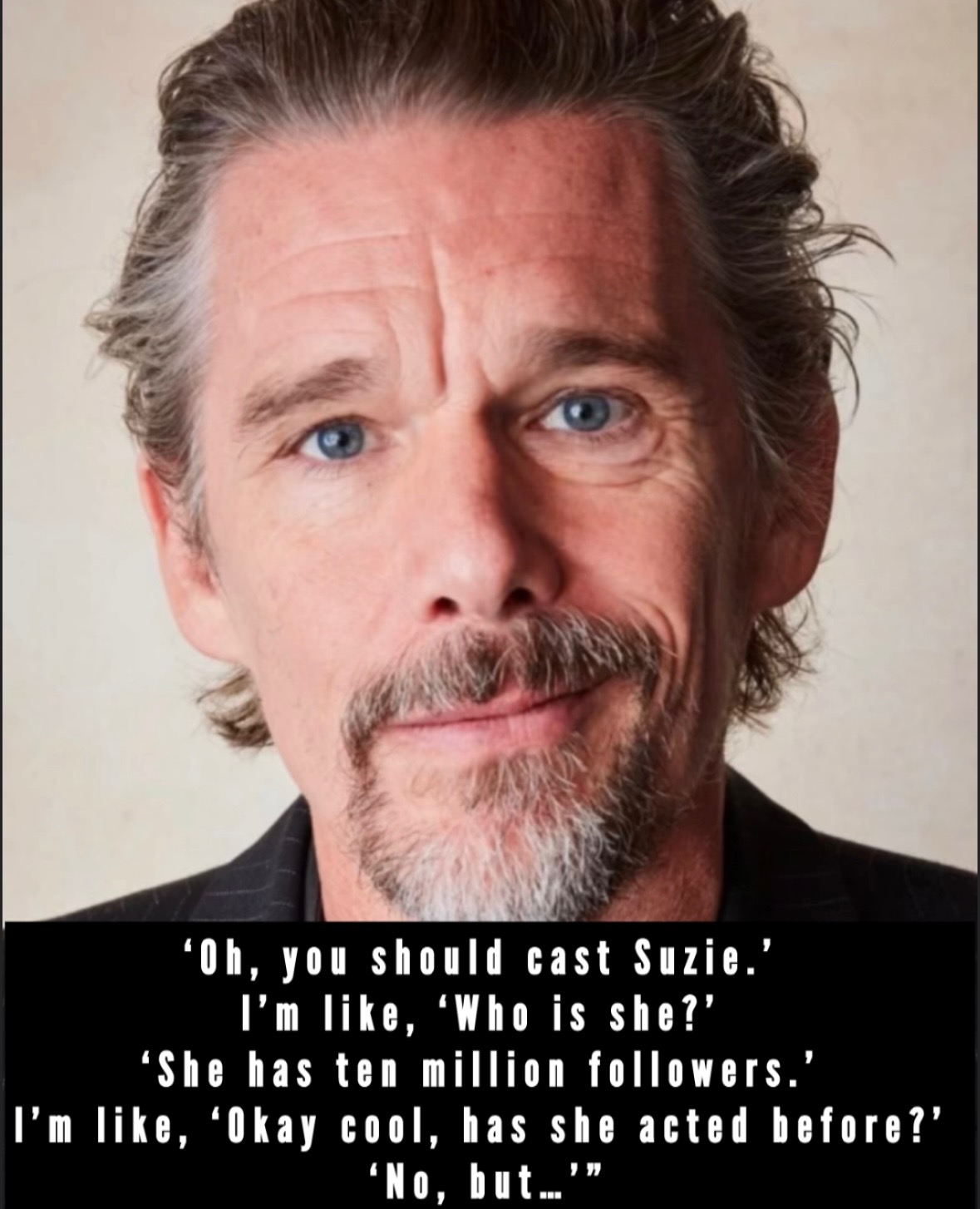 Hence, Ethan Hawke incredulously demanding, “So if I don’t have this public-facing [platform], I don’t have a career? And if I get more followers I might get that part?… What?” Further adding, “So many young actors that think being an actor is protein shakes and going to the gym…go to the gym if you want to, but that doesn’t make you [an actor]… Robert De Niro is not great because he has a six-pack. If the part calls for it, he’ll do it, and that’s awesome, but he’s so much more than that.” Certainly more than his followers—which don’t really exist as he’s not on social media (a choice that worked in his favor amid that gender discrimination lawsuit). But then, he didn’t come up during a time when every creative person was indoctrinated with the belief that they “need” to have social media. Not just as a means to “showcase their talent,” but to ensure they’ll even be considered by a “higher power” at all.