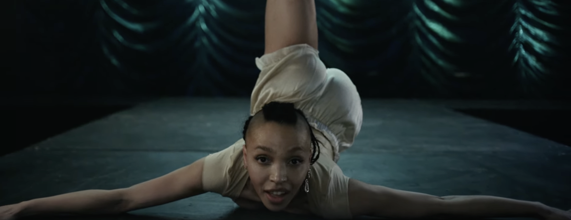 In another scene, Twigs lives out her Swan Lake fantasies by appearing in White Swan attire as she showcases some ballet moves to the rhythm of the song. Becoming truly lost in the music as she sings, “Lost in a world of childlike things.” In the next scene, she provides the kind of choreo that can easily be replicated on TikTok, almost like a meta nod to what the entire video speaks to, which is that music has been overtaken by the concept of “virality” (this point further driven home by the fact that, evidently, the video is so “long”—at eight minutes—that it requires YouTube to interrupt it with an ad…though the same didn’t happen with her also nearly eight-minute “Eusexua” video).