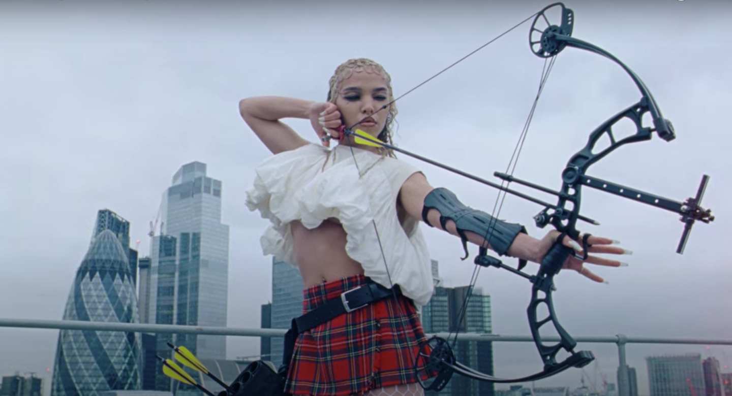 A cut to the Archer “alter ego” (because again, this song is all about ego) version of FKA shows her in white fishnets with black stilettos and a plaid skirt with a white, stomach-baring top (as already mentioned, it has a decidedly “…Baby One More Time” feel). She runs urgently along a platform and then up some stairs (in a shot with a disjointed, slow motion effect that would be right at home in an episode of Twin Peaks) where a bow and arrow conveniently await her on one of the steps. At the summit of the rooftop, the background of London’s iconic Financial District (or “The City of London,” if you must) looms behind Archer Twigs, who, incidentally, should probably be pointing her weapon in that direction instead.