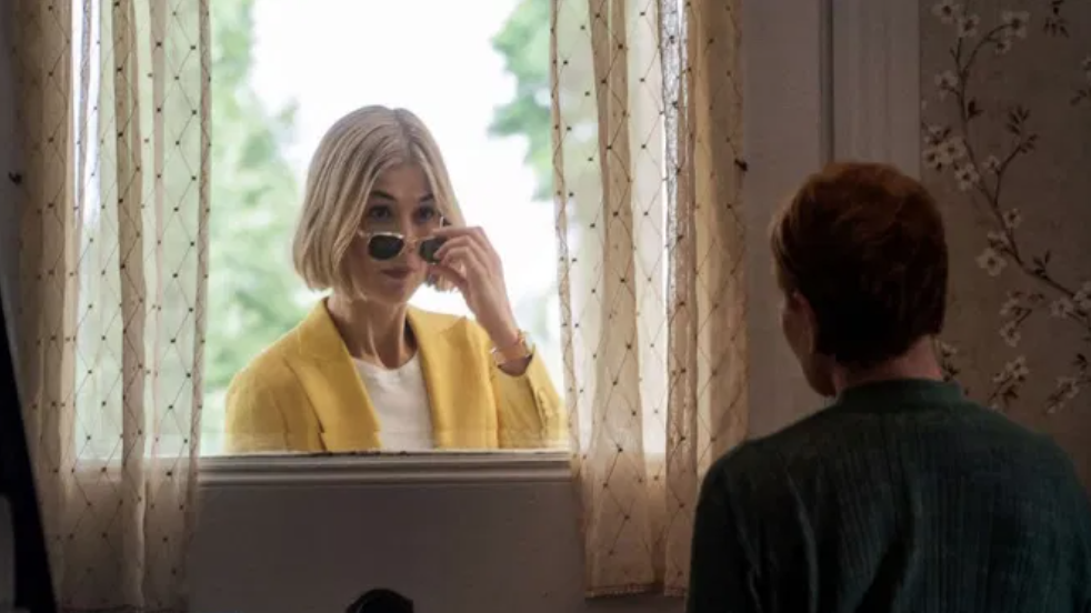 In a case of one of those movies where we’re meant to focus on the message instead of the various sharp detours away from plausibility, I Care A Lot centers on the power haircut that is Marla Grayson (Rosamund Pike, never one to shy away from a double-crossing role). Having established the perfect con operation of getting a Massachusetts judge to believe her every time she comes to him with the “proof” that an elderly person is incapable of taking care of themselves, Marla has quite an enterprise. One that she operates with the help of her criminal-savvy, police-connected girlfriend, Fran (Eiza González).