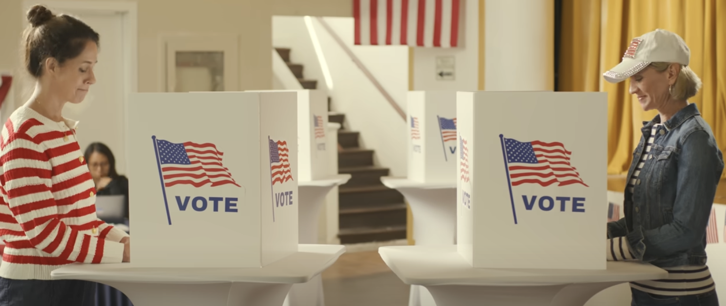 As the blonde wife wearing the bejeweled American flag hat glances furtively at another woman in the voting booth, they share a “knowing look” that indicates they’re both about to “betray” their conservative husbands for “the greater good.” Not seeming to be aware that the greater good is probably getting a divorce and breaking out on your own if you feel this afraid to be who you are. Like you’re goddamn Lucy Ricardo concealing the purchase of one too many hats in a month.