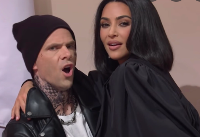 To further lampoon Kourtney, it goes without saying that a mention of her dating Travis Barker for no reason whatsoever (apart from some weird glitch in the matrix) is required. Thus, he appears to the narration, “Kourtney’s boyfriend, straight out of the year 2000, Blink-182’s Travis Barker.” Playing up the 00s element, Kim-as-Kourtney asks, “Will you drum ‘All The Small Things’ on my ass when we get home?” He vacantly responds, “Hands or sticks?” She then insists, “Both, baby.”