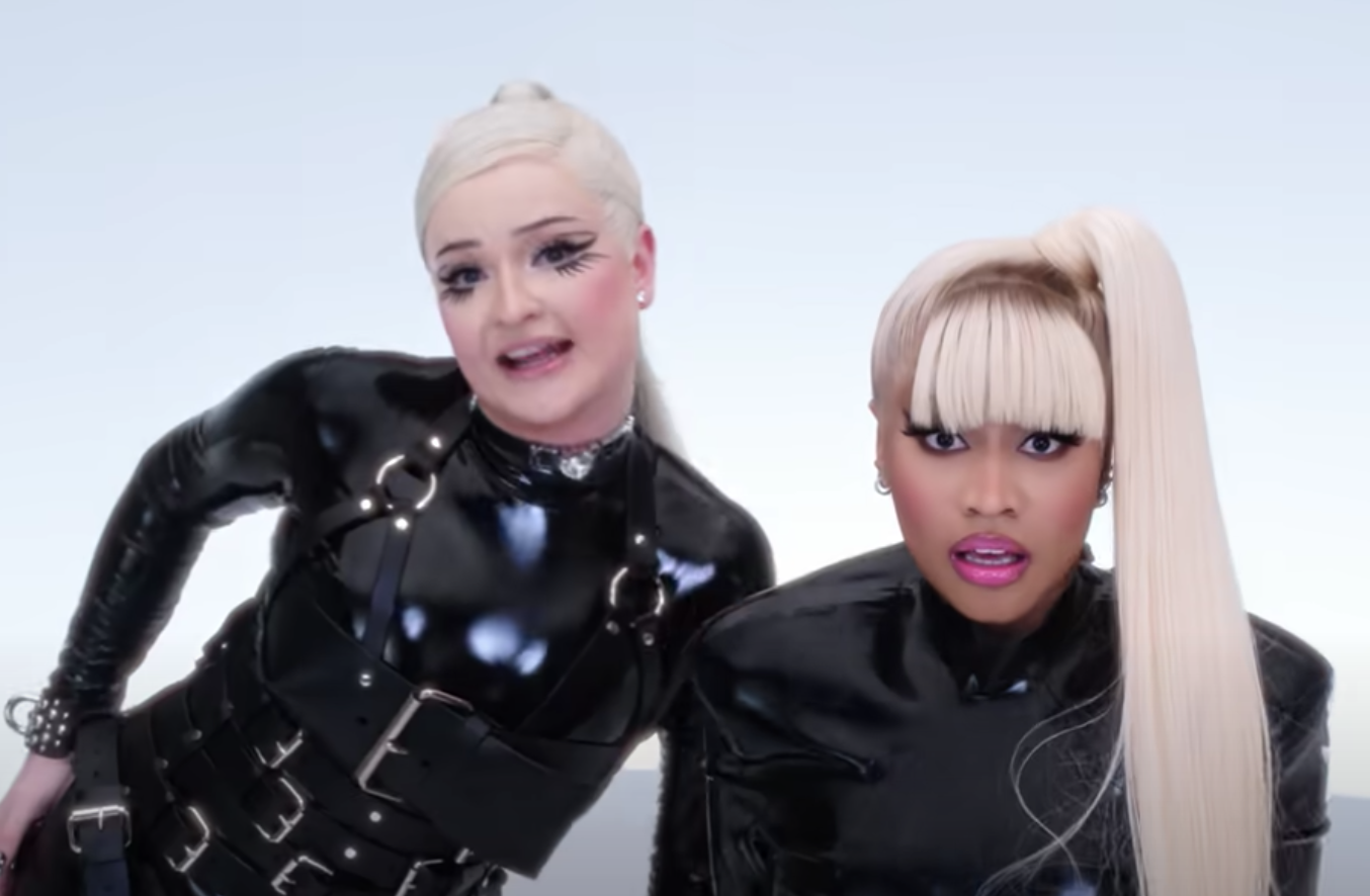 Although Petras assumed Minaj’s appearance on the single would offset any “weak points,” all her presence really does is take the song even further away from the integrity and sense of pure emotion that existed on the original. Dressed in her own dominatrix-y getup upon materializing at the one-minute, forty-eight-second mark, it doesn’t take Minaj long to acquiesce to the white ideal of the Barbie mold by matching Petras with a blonde high ponytail and a form-fitting black vinyl dress with pink heels as she babbles, among other verses, “I send shots, get ready, they may sting/I-I-It’s Barbie and it’s Kim Petras/Main character syndrome, they extras/We-we-we ain’t answerin’ questions/Click on a bitch ‘fore she finish her sentence.” Not exactly words that connote yearning or longing after a breakup. As was the case on “Better Off Alone.”
