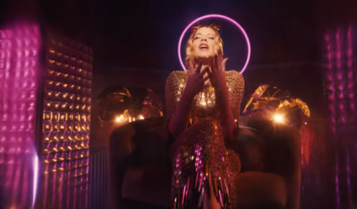 It would be one thing if Minogue grafted these tropes of the decade to make something new and complex, but the premise of the video is nothing beyond Minogue acting as some sort of Virgin Mary of Disco, a martyr to murder on the dance floor as she sits on a throne-like chair in a shimmering gold gown that almost looks like a modern take on chainmail.
