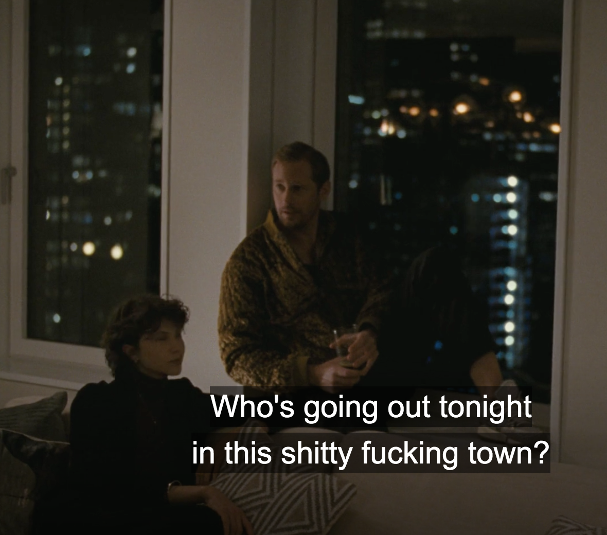 Even so, just as Lexi did, Lukas finds himself utterly unimpressed by the goings-on at this “event.” Which, to him, feels like a sad attempt on these people’s part at pretending they’re living it up in some “fabulous” town with a lifestyle that couldn’t possibly be had anywhere else. Yet if it’s so fabulous, why does it bum him out so much as he stares out the window? Just as Lexi sort of did as she lit her cigarette and then turned her back to the city to give the “revelers” a harrowing recap on the state of affairs in NYC. A merciless “summing up” tailored to those who are still delusional about its “untouchable clout.”