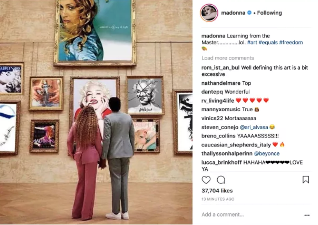 Madonna’s Instagram, at this point, has become nothing more than an expected hotbed of controversy–but what else could one anticipate when the queen of courting scandal once had to work even harder to market her “ignominy” and put in the time to create videos that would cause a stir? With Instagram, it’s as easy as 1) post photo, 2) caption and 3) let the masses tear it apart. This week’s Photoshopped image of Jay-Z and Beyoncé looking at works of art in the Louvre transformed into Madonna’s album covers caused almost as much outrage as Madonna’s (original) description: “Learning from the master…………….lol. #art #equals #freedom.” In addition to the Beyhive being quick to pounce on Madonna with attacks as low blowing as “thought you were like…you know…dead” and “Bey and Jay visiting the cemetery,” they also peppered in comments about racial insensitivity. Once again with nothing to lob at Madonna for criticism other than her age, another fan grasped at the stock straw of discrimination. Accusing Madonna of being tone deaf for her use of the word “master,” another enraged Bey fan added, “Did you really just post a pic of 2 Black people looking at you and refer to yourself as ‘the master’”? Yes, clearly Madonna must be the most racist woman in the world after adopting four black children, exchanging love letters with 2Pac in prison, charitably fucking Dennis Rodman and herself being mistaken for a black singer before an image of her face was ever released on an album cover.