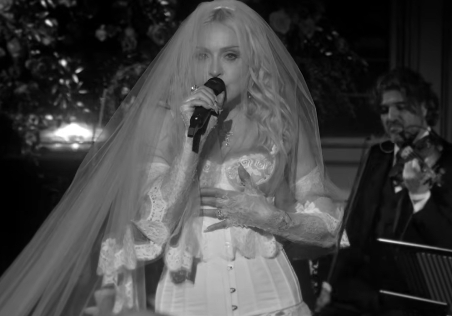 But no, what is Madonna if not a seasoned showwoman who won’t let fear dictate what she decides to wear? And so, to compliment the “amoroso” tone of her attire, the edit opts to lend some added “romance” to the affair. This in large part because the filmed version of the performance is shot in black and white, opening on an array of candles before then cutting to the string orchestra meant to punctuate the live sound of the track, originally sung by Patty Pravo. And yes, oddly, Madonna has increasingly started to look like a Pravo impersonator, or maybe it’s the other way around—who knows? In any case, there’s just one more hyper-romantic shot—a close-up on a bouquet of roses (again, very bridal)—before the camera homes in on Madonna’s corset bustier situation. Obviously, she couldn’t reference the cone bra too in this context, for that’s not Dolce and Gabbana territory.