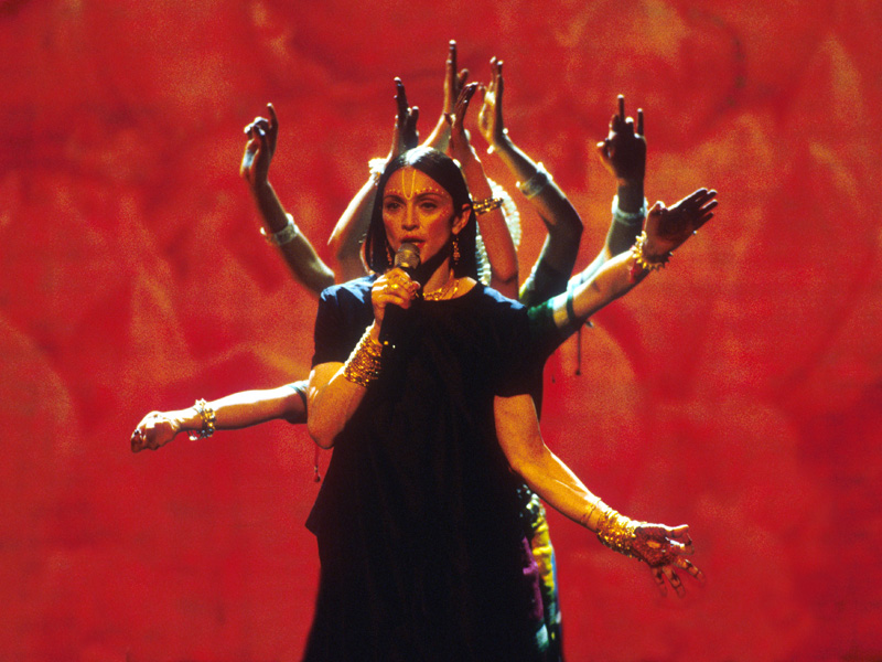 26) “Shanti/Ashtangi” and “Ray of Light” at the MTV Video Music Awards, September 10, 1998: While she had her Botticelli-inspired hair on lock at Oprah, this was Madonna at her most balls to the wall on appropriating both Indian and Asian-inspired flavors for her celestial new persona. With backup dancers dressed in garb that seemed to want to pay homage to Vishnu (there is a moment of choreography that also does the same), the backdrops of the stage, too, were Indian in influence. As though Madonna had just gone through her own The Beatles discover ultimate truth in India period, she is unabashed in parading her newfound inspirations before stripping off her costume into an extremely baring white tank top with Lenny Kravitz joining her onstage to writhe over her with his guitar as he played “Ray of Light.” On a side note, no one said this was a memorable performance for it being her best vocals–in fact, perhaps slightly worse than what people said of her Eurovision appearance.