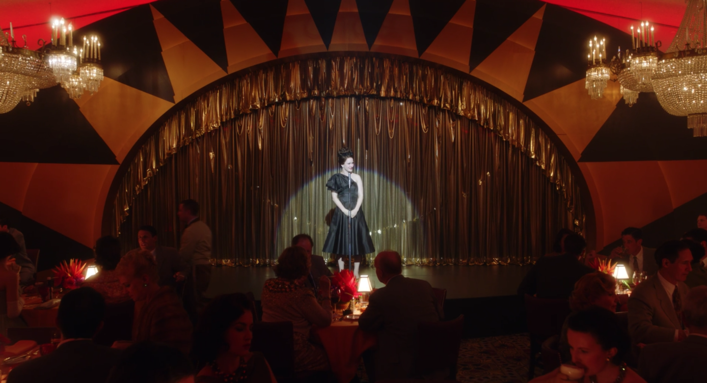 “So, my home, New York, is a very old city. It told Philadelphia to–” Midge can’t get through the joke as a woman keeps yelling out the name “Berta” to get her friend’s attention. After directing the two to one another from the stage, she hopelessly continues, “I’m from New York”–as though, somehow, this time, people will understand how significant that is. Except that it’s not. A bubble often burst for egoists like Miriam. A dissolve to the latter half of her set informs us that Miriam has refused to give up the ghost as she delivers a punchline, “And I was like, ‘Take the A train, it’s faster.” Bitch, no one gives a shit outside your cult city and they have no idea what you’re talking about, nor do they really care to. They’re not a “subway material crowd,” Miriam tells them. Why would they want to be when driving cars the size of boats was all the rage out west in that period?