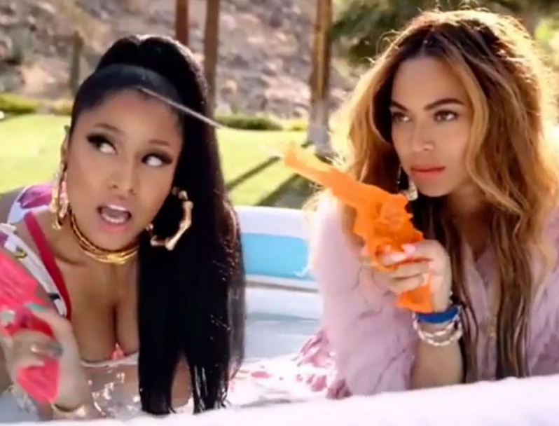 Set in Coachella, for some reason (maybe a subtle dig at the narcissism of the Coachella Valley Arts & Music Festival?), Minaj and Bey get right into feeling themselves with tight-fitting tank tops and gyrating dance moves. Soon, Minaj and Bey are feeling each other in an inflatable pool and then find time to dance in a posh Palm Springs house featuring a conveniently placed Tidal poster. Meanwhile, Nicki starts cooking in the kitchen, then dancing in a “PERVERT” jersey.