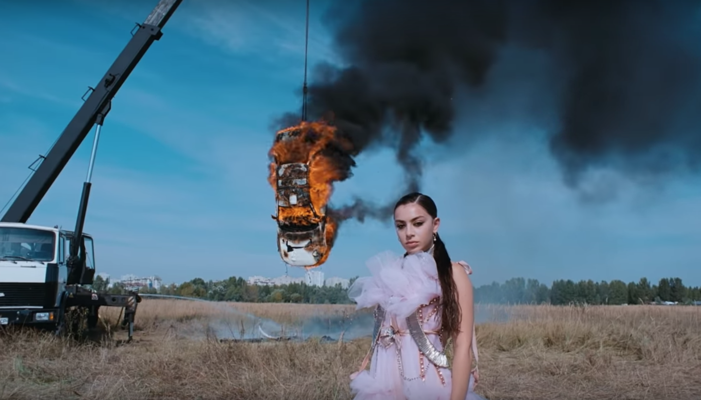 It would seem she instead chooses to take her sexual frustration out on the white Mercedes by torching it and then settling for the real live horsepower of an actual horse, stroking it as the camera does a strategic close-up on her watch (accenting some sort of struggle between a love of material and the dormant knowledge that possessions are meaningless). Again, there appears to be some latent theme about the triumph of nature in the face of frivolous human acts (the nonsensical fireworks display toward the end of the video also being further proof of that). And as the horse gallops past the crushed Mercedes (interwoven with shots of it on fire because the sequencing in this “plot” is all very fractured), one can’t help but think that’s what all of the animal kingdom is trying to do at any given moment: get the hell away from man and his machines. At the very least, however, it seems Charli is advocating for recycling, as she very clearly raided Lily Allen’s closet for this pink ball gown from her Alright, Still era.