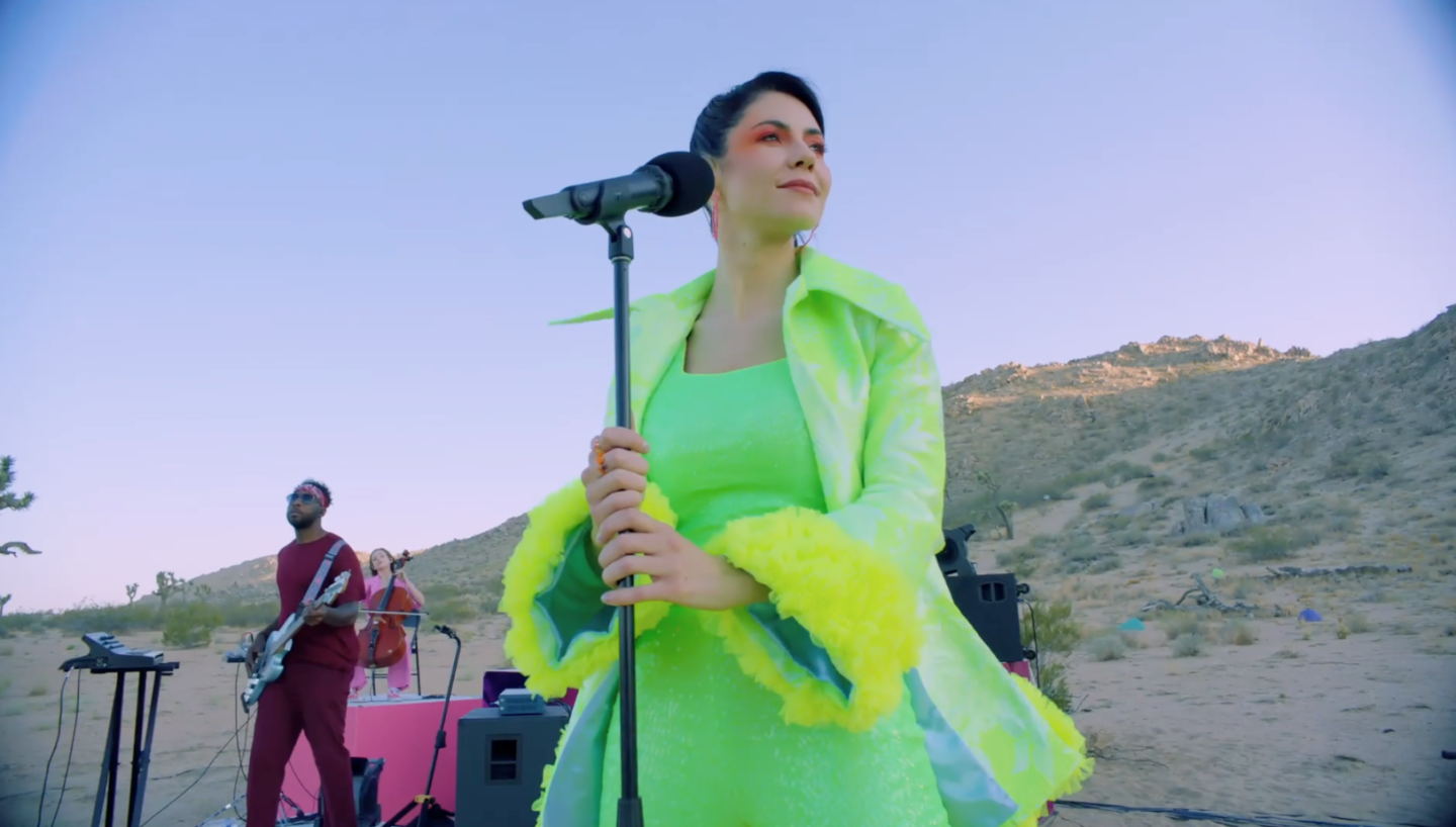 With her high ponytail echoing the elegance and poise of Barbie circa the 50s and 60s meets Ariana Grande pre-Positions, MARINA’s silhouette from the side becomes especially iconic during the coda of Ancient Dreams: Live From the Desert. Poignant and heart-wrenching, it’s difficult to imagine any show MARINA could put on now without closing it with “Goodbye.” An ode to bidding adieu to the different versions of our previous selves that we can no longer identify with, MARINA hits all the high notes as she croons, “Goodbye to the girl that I was/Goodbye to the girl that you lost.” All while her neon green costume (rounded out by bright blue, strappy heeled sandals) is contrasted against the desert sky as the sun sets—literally and metaphorically.