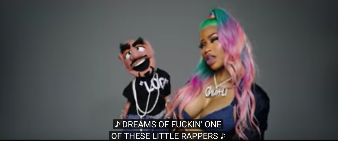 At the very least, however, she has her couture to entertain her where these pussy men cannot, strutting and dancing around in various looks in between the camera cutting to the Muppet-esque incarnations of these rappers. DJ Khaled in particular looking utterly unbangable, even as a puppet (for some reason, one would think that would make him slightly more aesthetically appealing). So Nicki must content herself with the things that best distract women: appearance. With hair color changes that are dizzying even to the most seasoned of hairstylists, Nicki wields her body in a manner sarcastic (shaking around her tits with her own hands at one point for added tongue-in-cheek effect). For she knows that no pussy man can handle what she’s got to offer. It’s simply “inoperable machinery” to the average ill-equipped panisse. But at the very least, she can maintain a sense of humor about it, even though the ones she’s speaking on (not to mention her overall aim at clowning on men in general) might not be able to.