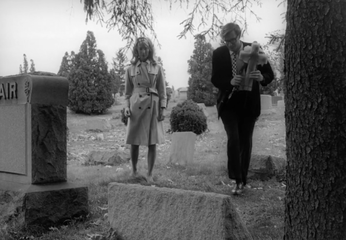 Johnny’s cynicism about being at the cemetery (only obliging the task on behalf of his mother) persists when he mocks the ceremonial arrangement they brought along to place on the grave, reading the words on it that say, “We still remember.” He balks, turning to Barbra to assert, “I don’t. You know, I don’t even remember what the man looked like.” This blunt admission, which of course scandalizes Barbra, raises the question about how, if someone in your life dies when you’re so young and can’t even remember them (unless you’re Madonna losing her mother at five), is it a matter of genuine sentiment or forced duty to visit their gravesite? Barbra is convinced that it is the latter, devoted to the concept that the one thing that truly separates humans from animals is their ability to mourn the dead, to “show reverence” for those who came before them, those without whom they wouldn’t be here today. Johnny, on the other hand, displays total contempt for the entire frivolous practice of mourning. Of how death has become yet another racket through which opportunists can delight in their hungry capitalistic tendencies.