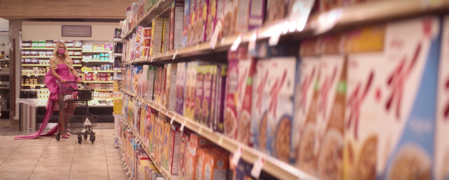 Among the numerous tropes brandished for the sake of “comedy” in Cooking With Paris, the most consistently used one is of Paris Hilton at the grocery store dressed to the nines at the beginning of each episode. It all starts with a bubblegum pink number befitting of Barbie or 80s-era Ivana Trump. As she imagines herself in this 80s world complete with a soundtrack to match, her reverie is interrupted by the broken illusion of one of her crew members fanning her from behind-the-scenes. Subsequently plopping many boxes of cereal into her cart, the camera cuts to her scurrying down the refrigerator aisle like she’s all alone in the joint. Which is just how any Stepford wife would shop, minus the part where they might get too lively with their movements.
