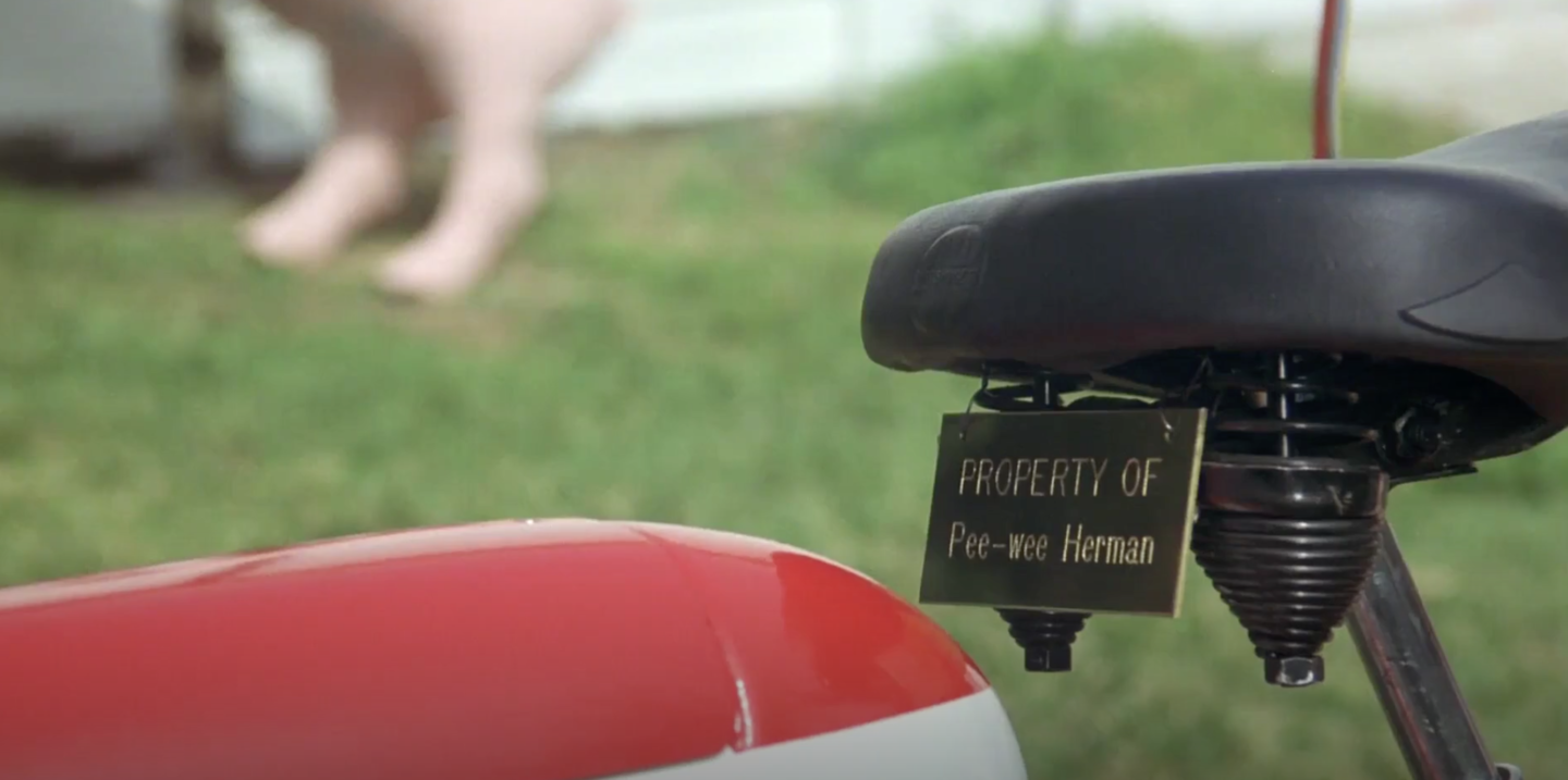 What’s more, Reubens and Burton are adept in the language of how to make someone appear left out for not having the “right” product. Or at least a product of a similar vein to the “hottest thing.” So it is that, just after Pee-wee’s bike is stolen, he’s forced to wander the strip mall street on foot, like some sort of peasant, while everyone else around him is on a bike. Even the motorized toys. Thus, he’s now been cut down to size, made “lesser than”—when only twenty minutes ago, he was the peacocking bike rider trying to outperform the tricks of the kids around him riding on less cumbersome wheels. The underlying message: you are what you own. Property is the thing—this being why it’s such a standout moment to see that one of the crowning additions to Pee-wee’s bike is an engraved plate that reads, “Property of Pee-wee Herman.” And what’s more essential to capitalistic adherence than owning property? Property that becomes so easy to confuse with “characteristics” of ourselves. So it is that Pee-wee’s identity is as entrenched in the bike as it is in making random, off-color laughing sounds. His refusal to accept any substitutes also speaks to the concept of brand loyalty. Nothing else will compare to or ever be as good as the bike Pee-wee had before. He wants what he wants, and nothing else will do.