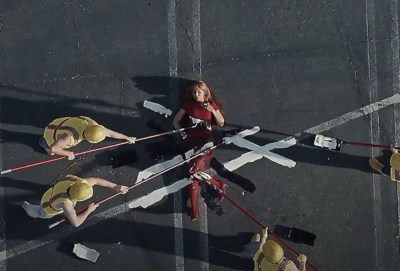 The video starts to get “steamier” when multiple “parking lot painters” dressed in construction attire (wearing the signature vest of said uniform without any shirt underneath it, of course) start to get in on the line-demarcating project. At one point, this means painting right over PinkPantheress (who lies supine on the pavement because why not?) in a fashion that evokes that scene of the “brush dog” in Alice in Wonderland “de-lining” an area and going right past Alice as he does so (so the inverse of what happens to PinkPantheress). When they’re done painting over her, she gets up as though in a sad daze that it’s over (talk about a particular kind of kink).