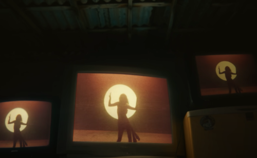 Lying languidly on the couch is a girl watching TV (the kind you would see in the 80s, hence the “out of time” vibe of the video). On it is Alejandro, before Gomez appears with a giant sunset behind her–in an aesthetic that smacks of something that would play on a karaoke screen (remember karaoke?). We soon see the girl from the couch on the beach herself, dancing in front of a goalie net as Motorcycle Boy gazes at her from afar with the patent initial feelings of yearning.