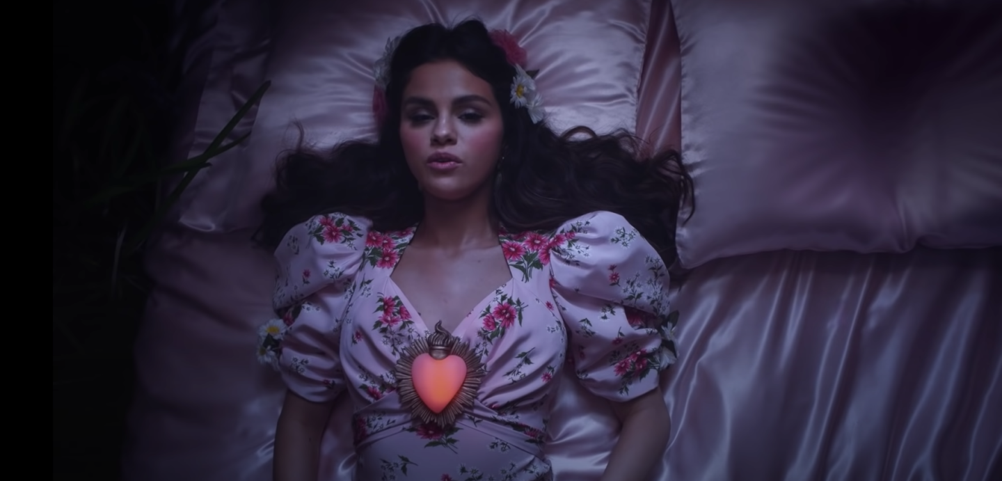As we travel through the crystalline heart that is supposed to belong to “Virgin” Mary, we soon pan out to reveal that this fragile corazón is, in fact, embedded within Selena Gomez’s chest. After all, if she’s going to make this grand foray back to her Mexican roots, it’s only right to bring the Virgin Mary into it with the visuals for the accompanying video for “De Una Vez” (that’s “at once,” for the gringas out there). And sure, Jesus has a Sacred Heart, but Mary has an Immaculate one. The point is, Gomez wants you to know her own is also divine in its ability to heal (though that doesn’t mean she can’t still indirectly throw shade at the ex whose aunt-in-law has been pretending to be Spanish for the past decade, give or take).