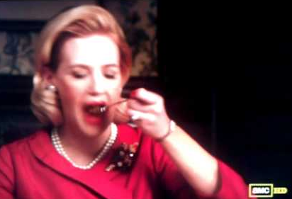 Betty, who shows us the power of restraint as the fifth season comes to a close, is a true inspiration for us all on Thanksgiving–in fact, the only thing that could make her more inspiring is if she was actually thin while refusing to engage in gorging on carbs and other assorted obesity-promoting foods. Not only is Betty a whiz at suppressing her appetite, but she’s also a genius at suppressing her emotions–which is key to surviving your family during the holidays. So when you think of shoveling another bite of mashed potatoes into your mouth this Turkey Day, just imagine Betty Draper/Francis counting her points as she nibbles on a pea. It will help keep your so-called appetite in check.