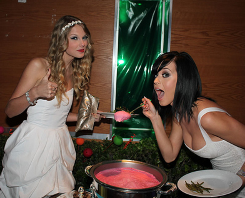 Perry took her time in responding with “Swish Swish,” waiting an entire three years to re-stoke the flames of animosity. Maybe she thought that if enough time had passed, Swift wouldn’t be bothered to respond to the goading once again. Perry thought wrong, almost as wrong as thinking it would be a good idea to marry Russell Brand. Because Swift is your typical undercutting white bia, she knew to lie in wait to make just the right move that would pack a wallop in insulting Perry right back: re-releasing her entire back catalogue on every major streaming service including Spotify.