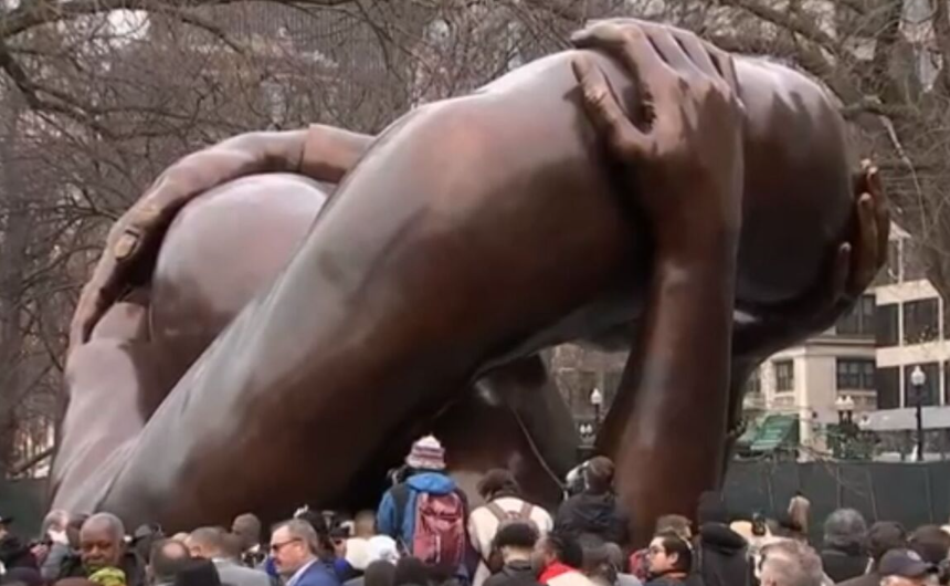 One supposed it sounded “harmless” enough. “Brilliant” even. Hank Willis Thomas certainly must have thought it was when he pitched the idea. An “emulation” (or rather, badly attempted emulation) of Martin Luther King Jr. embracing his wife, Coretta Scott King, after winning the Nobel Peace Prize in 1964. That was the photo Thomas took “inspiration” (ostensibly very loose inspiration) from in constructing the giant bronze statue that now sits in Boston Common (Boston being the site of the work due to King meeting Scott in that city, as well as it being the finishing point of a freedom march he led in 1965). At twenty feet tall, it would be an understatement to call the sculpture pornographic (made all the more so by its grotesque size). Yet there’s no other word to employ in order to paint the picture of what one views if and when they encounter it.