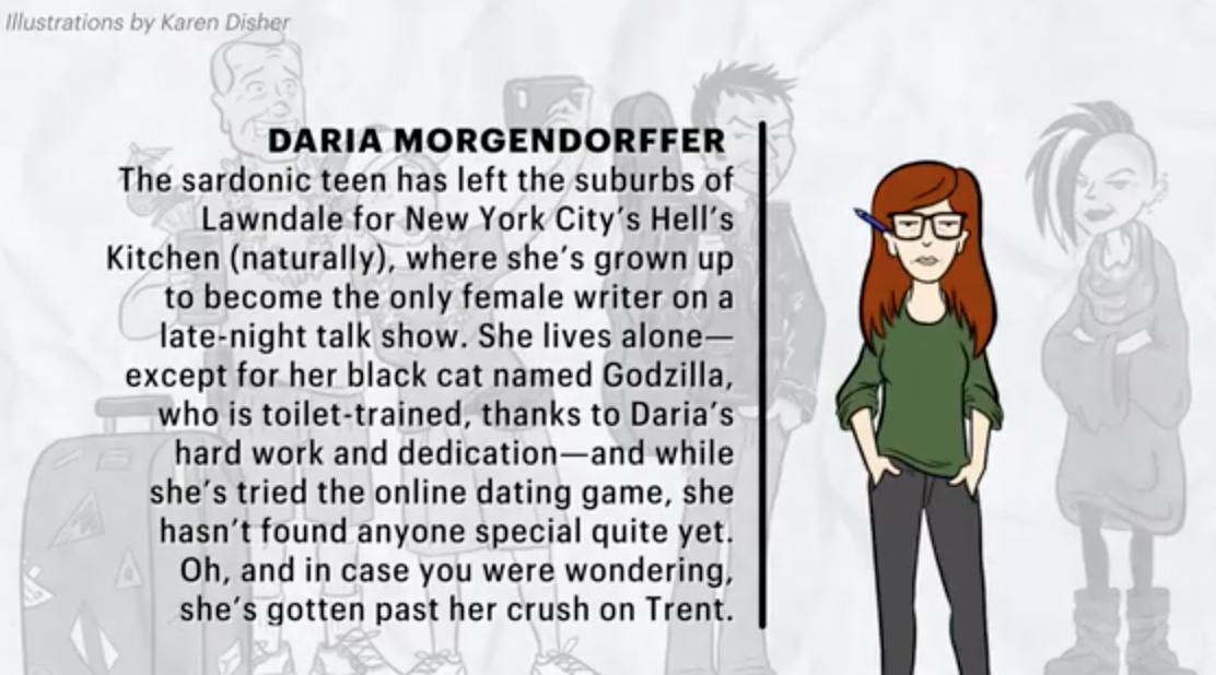 There should be no shock anymore when it comes to what the world will allow to be rebooted–even entities that have no room for story or character growth of any kind. And yet, still, some of us are naive, hopeful and trusting enough to believe that certain franchises (yes, I deem Daria a franchise) are capable of remaining untouchable. And maybe Daria co-creator Susie Lewis and character designer Karen Disher had nothing but the best of intentions with their recent spread in Entertainment Weekly detailing a speculative “where are they now?” segment featuring some extremely aged looking staples of the show. But at least it’s not an actual reboot–just yet.