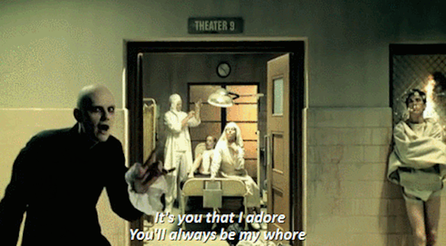 To iterate the somber nature of the video, there is the overall funereal theme of the song, packed with lyrics proclaiming eternal love and possession, declaring, “And I’ll pull your crooked teeth/You’ll be perfect just like me/You’ll be a lover in my bed/And a gun to my head/We must never be apart.” While Valentine’s Day is for that fucking cutesy bullshit form of “love,” Halloween reserves a special place for the dark side of that often life-ruining entity the French call l’amour, adding to the hand-in-handedness of “Ava Adore” to this day of gloom.