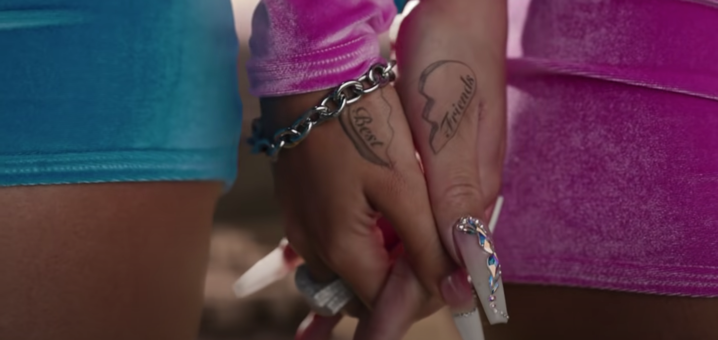 As the video draws to a close, we see a tight shot of Saweetie. “Do not be scared, okay?” she says suggestively as she unzips the top half of her velour tracksuit, making us believe this friendship is about to get taken to the next level (and even Paris and Lindsay ended up making out for the camera eventually). But what we soon come to find is that she’s merely preparing her “other half” (made literal by the fact that they share the classic “Best Friends” broken heart by way of hand tattoos that join together for a perfect visual representation of their bond) to jump off a cliff naked into the water below. You know, sort of the way Thelma and Louise drive off a cliff together, but with slightly less suicidal implications.