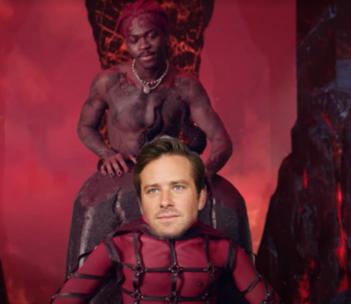Because the video clocks in at barely three minutes, Lil Nas X saves the most “scandalous” scene for last: twerking on Satan, who seems to want (desperately) to show that he likes it, but also doesn’t want to lose his stoic edge. Apparently lulling him into a submissive false sense of security, Lil Nas X snaps Satan’s neck unexpectedly so as to take over the crown. Therefore, it’s a New World Order in “hell.” The place where the debauched are deemed to belong. And yet, in Lil Nas X’s version, debauchery is just another word for finally being yourself. So yeah, technically, Armie Hammer could exist in this environment. But not Timothée Chalamet, who seems to embody a repressed aura in every way.
