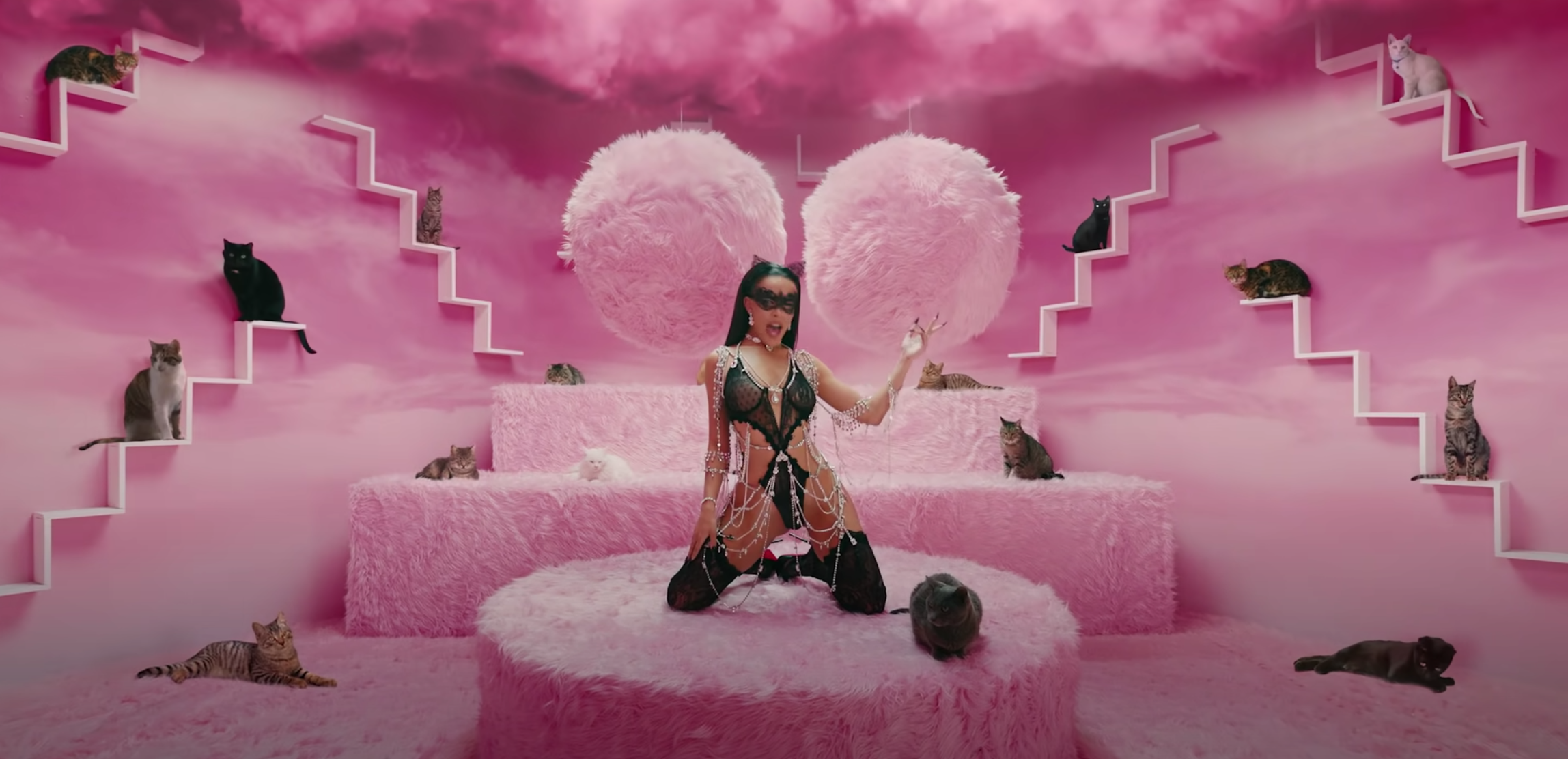 After settling on something “fly” to don, he then zips along in his car through a “city” that looks like just about every other one portrayed with a “metaverse” slant in any Doja Cat video (including “Need to Know” and The Weeknd’s “In Your Eyes” remix video [even if animated]). When he shows up at Doja’s door, she answers it in a way one would expect Rihanna to—that is to say, clad in lingerie. She eyeballs him seductively and then opens a trap door for him to fall through. Down the rabbit hole… or, in this case, Doja’s hole. And as he drops through cotton candy-tinged clouds to land in Doja’s sex lair, it’s here that more “subtlety” abounds as Doja appears in a bondage-inspired look surrounded by a coterie of cats against a very pink backdrop (and two giant, fluffy pink balls over Doja’s head). Tu comprends? Pussy.
